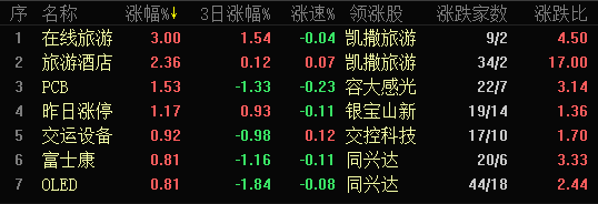 从盘面上看,在线旅游、PCB、富士康等概念板块涨幅居前,石油行业、电子竞技、数字孪生等概念板块跌幅居前。