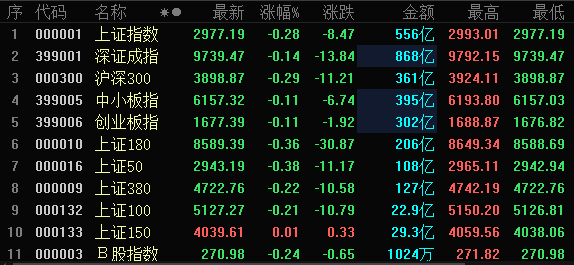 财联社9月19日讯,A股三大股指高开低走,集体翻绿,整体上仍然维持震荡格局。截至发稿,沪指跌0.28%,深证成指跌0.14%,创业板指跌0.11%。剔除ST及退市整理个股,两市不到20只个股涨停,2只个股跌停,北向资金当前净流入7.9亿元。