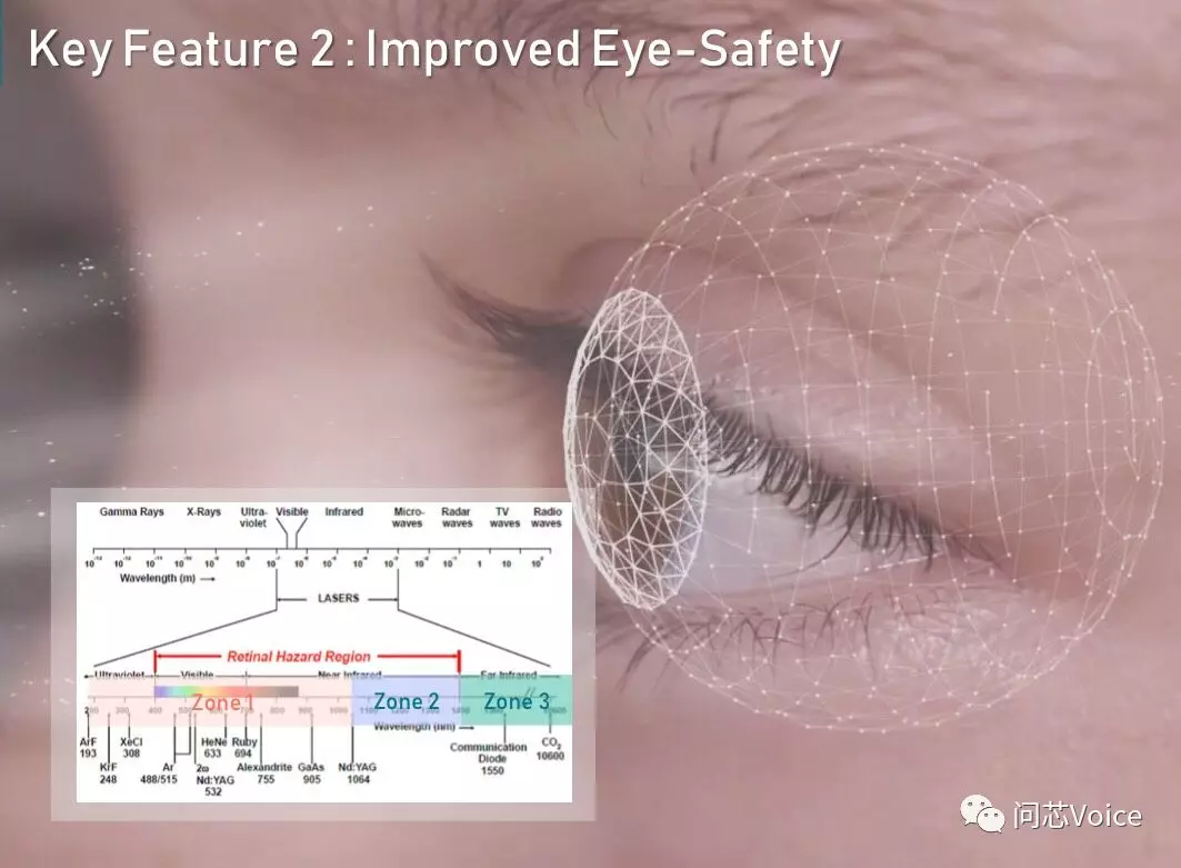 目前主流的 3D 传感器解决方案的波长多小于 1000nm,主要是 850nm、940nm 两种,而人类视网膜会吸收在此一波长区段的雷射能量。试想,人眼在强光之下,瞳孔会反射性变小,但 940nm 波长之下,虽然人眼是可以吸收的,但如果雷射坏掉或设计不当,人眼无法感知和反应,无形中是在伤害眼睛。