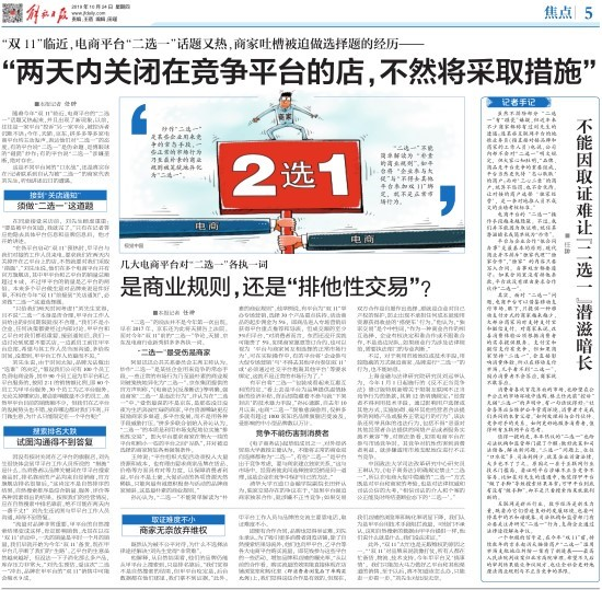 刘先生表示,“在各平台启动‘双11’预热时,甲平台与我们对接的工作人员来电,要求我们在两天内关掉开在乙平台上的店,不然就要对我们采取‘措施’。”刘先生表示,甲平台和乙平台对我们都很重要,“假设我们公司有100个员工负责电商业务,其中90个员工是为甲平台和乙平台服务的,按照2:1的销售额比例,即60个员工为甲平台服务,30个员工为乙平台服务。无论关掉哪家店,都会影响数量不少的员工。开门做生意,为什么只能限定在一个平台呢?”