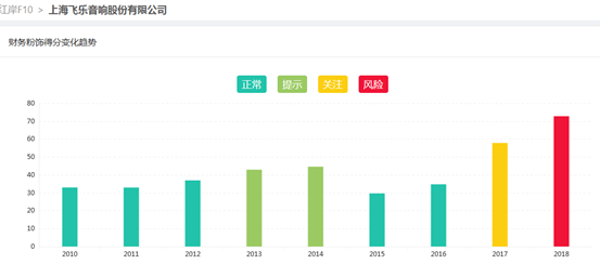 事实上,飞乐音响2017年的财务粉饰也被红岸风险挖掘系统提前捕获。红岸风险挖掘系统显示,飞乐音响2017年财务粉饰为关注级,2018年则上升到风险级。下图为红岸研究中心对红岸系统中飞乐音响财务粉饰得分变化趋势的截图: