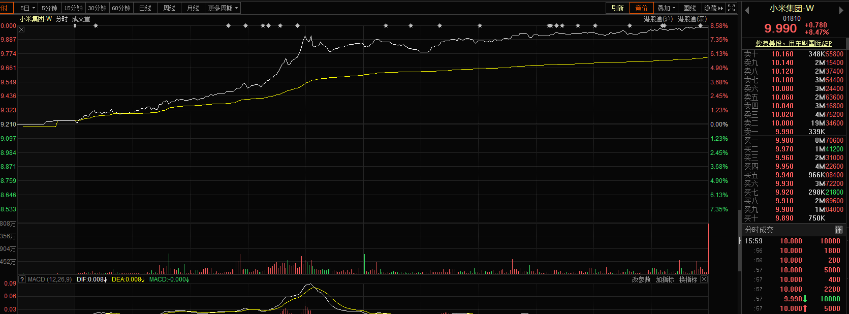 财联社(上海,研究员 王天勇)讯,今日小米集团股价大涨,盘中一度突破10港元大关,截至收盘,小米集团大涨8.47%,报9.99港元。