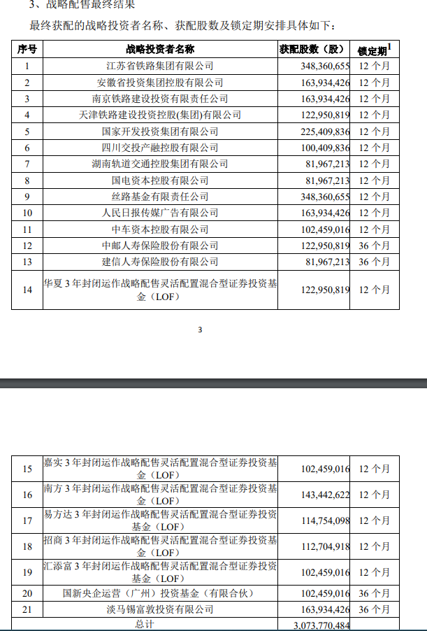 财联社1月7日讯,京沪高铁战略配售结果出炉,丝路基金、江苏省铁路集团各获配3.48亿股,安徽省投资集团获配1.64亿股,人民日报传媒获配1.64亿股;淡马锡富敦投资有限公司获配1.64亿股,锁定期36个月。此外,华夏、招商、易方达、南方基金、汇添富、嘉实均有参与。
