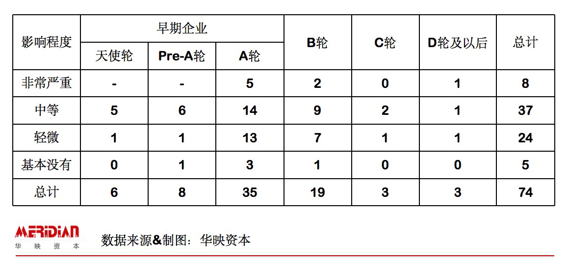 其中,10%企业表示影响较为严重、50%企业影响一般、40%企业影响轻微或基本无影响;受影响的企业中,65%左右属于早期企业;疫情影响具体体现在现金流紧张、线下工作暂停暂缓、供应链调整、营销投放效果下降、融资节奏暂缓、获客难度增加等层面。