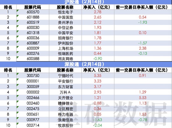 【北上资金今日净流入43.23亿 恒生电子净买入2.78亿】财联社2月14日讯,北上资金今日净流入43.23亿元。沪股通方面,恒生电子净买入2.78亿,中国国旅净买入2.65亿。深股通方面,宁德时代净买入5.35亿,平安银行净买入3.23亿。