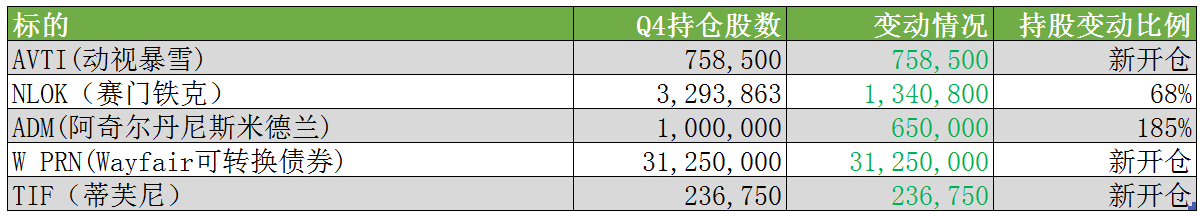 在本季度索罗斯加仓规模前五的股票中,动视暴雪、赛门铁克和蒂芙尼都是本季度新开的仓位,而农业股ADM以及美国电子商务公司的债券获得了显著的加仓。值得一提的是,除了上述标的外,索罗斯在Q4还新建仓了施乐看涨期权、iShares MSCI新兴市场ETF看涨期权、波音看涨期权等多支衍生品。
