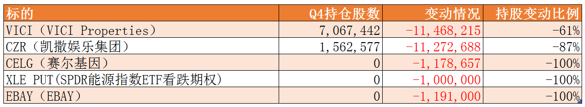 在减持规模前五的股票中,赛尔基因、Ebay和SPDR能源ETF看跌期权遭到了清仓,而VICI Properties和博彩公司凯撒娱乐出现了大比例的减持。