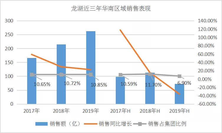 2017至2019年,龙湖华南区域的销售额虽然逐年增长,但增长较缓,华南区域占集团总销售的比重也处于10%至11%之间。