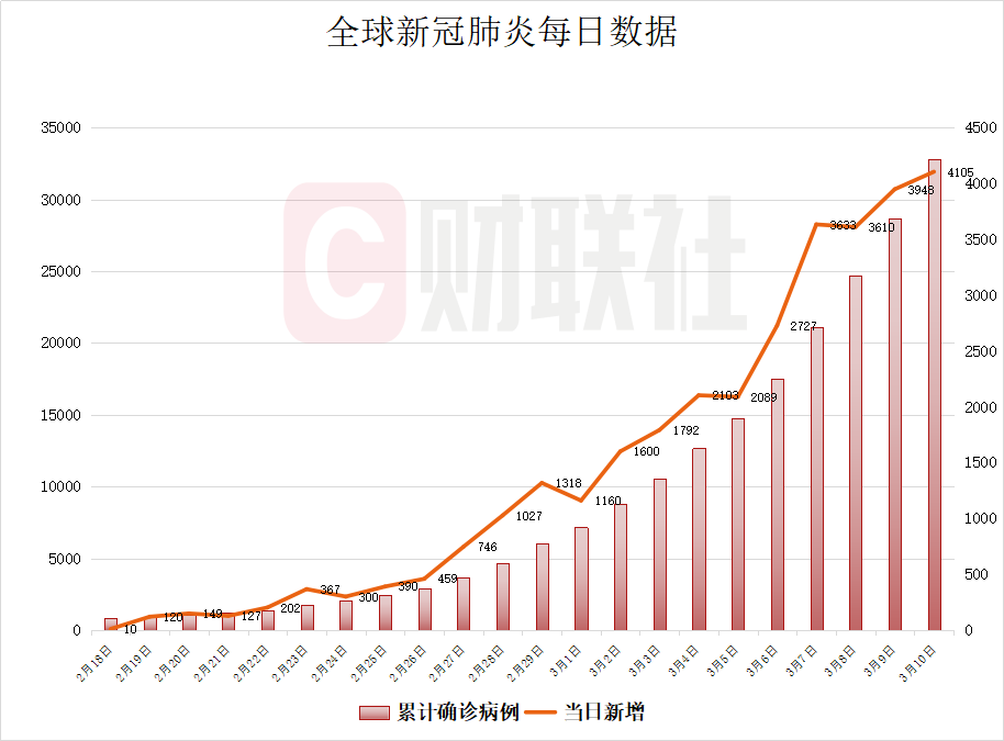 财联社(上海,编辑周玲)讯,据世界卫生组织公布的最新数据,截止3月10日欧洲中部时间10点,全球除中国外新增新冠肺炎确诊4105例,累计确诊32778例(含“钻石公主”号邮轮)。