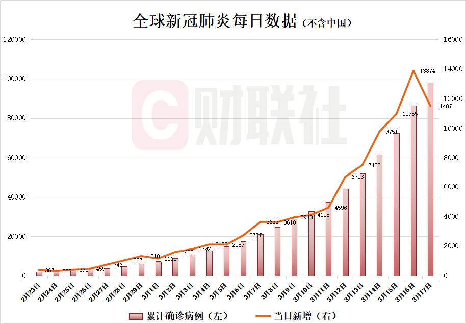 世卫组织每日疫情报告显示,截至欧洲中部时间17日10:00时(北京时间17日17:00时),中国以外新冠肺炎确诊病例较前一日增加11487例,达到97996例;中国以外的死亡病例较前一日增加462例,累计达到4195例。
