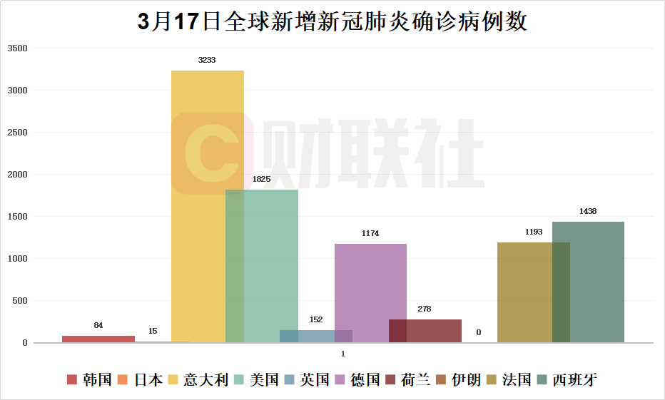 欧洲地区确诊病例上升较快,意大利新增3233例,累计确诊达到27980例;法国新增1193例,累计确诊达到6573例;西班牙新增1438例,累计达到9191例。