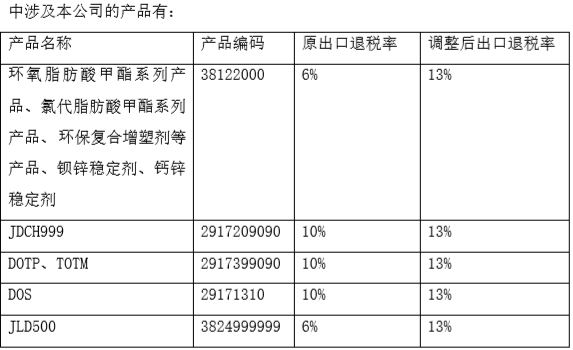 【嘉澳环保:公司部分产品出口退税率提高】财联社3月18日讯,嘉澳环保公告,2020年3月17日,财政部税务总局公告2020年第15号《关于提高部分产品出口退税率的公告》。经核实,提高出口退税的商品中涉及本公司的产品有环氧脂肪酸甲酯系列产品、氯代脂肪酸甲酯系列产品、环保复合增塑剂等产品、钡锌稳定剂、钙锌稳定剂、JDCH999、DOTP、TOTM、DOS、JLD500。出口退税率从之前的6%、10%提高到13%。