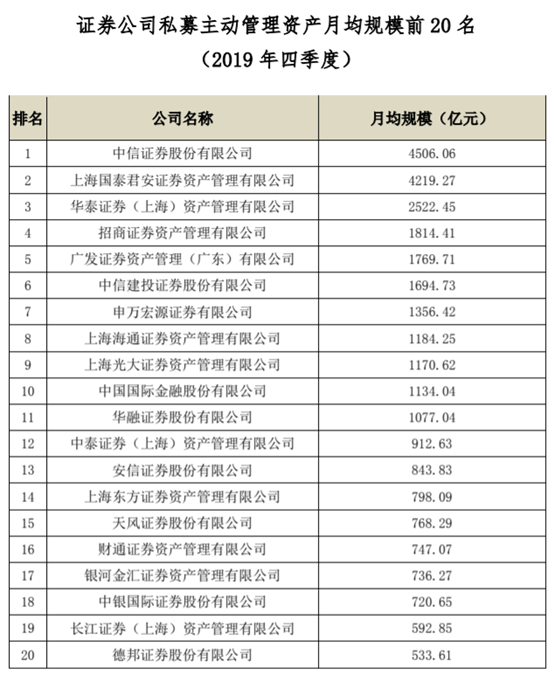 从中基协公布的2019年四季度证券公司私募主动管理资产月均规模前 20 名来看,天风证券以月均规模768.29亿元排在第15位。