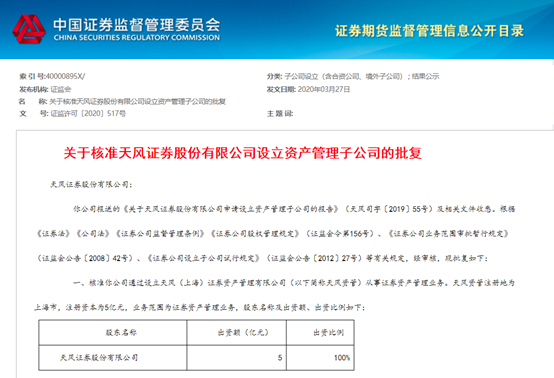 4月9日,证监会发布了天风证券设立资管子公司的批复。