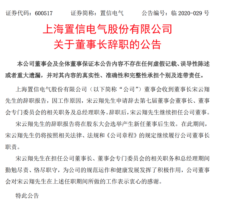 财联社(北京,记者 陈靖)讯,4月16日晚间,置信电气发布公告称,因工作原因,宋云翔申请辞去第七届董事会董事长、董事会专门委员会的相关职务及总经理职务。
