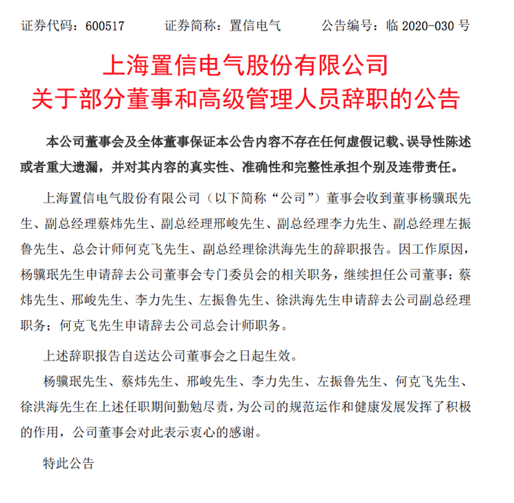 此前在3月30日晚间,置信电气发布了一系列人事变动公告。