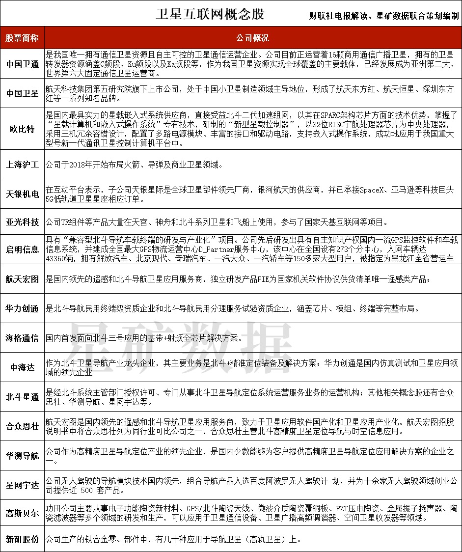财联社电报解读联合星矿数据整理卫星互联网相关上市公司,详见下表: