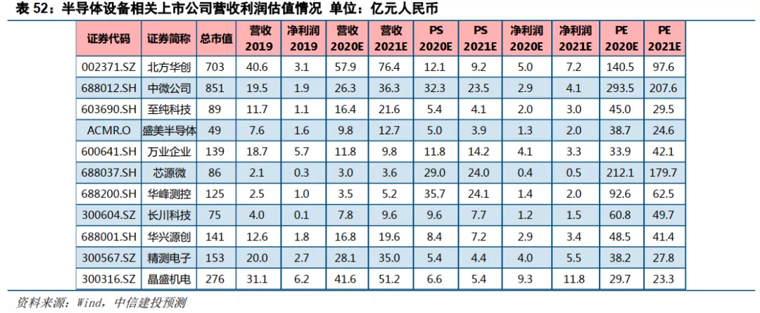 建议关注:北方华创(刻蚀/镀膜/热处理/清洗)、中微公司(刻蚀/镀膜)、盛美(清洗)、至纯科技(高纯工艺/清洗)、上海微(光刻机)、华海清科/中科信(CMP)、中电48所/万业企业(离子注入)、屹唐(刻蚀/热处理/去胶)、沈阳拓荆(PECVD)、芯源微(涂胶显影/去胶/清洗)、上海精测/上海睿励(过程控制测试)、长川科技/华峰测控/华兴源创(测试分选)、晶盛机电(硅片长晶加工)。
