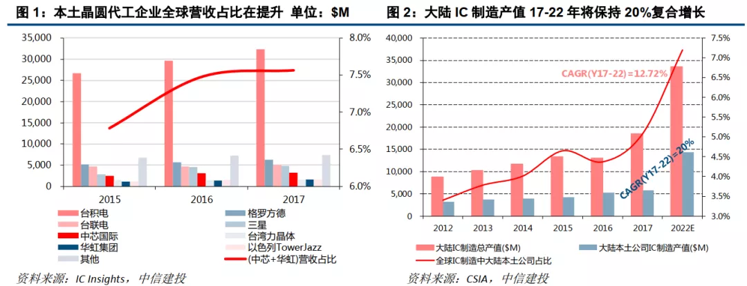 晶圆代工产能方面,2017年全球代工营收约623亿美金,中芯国际、华虹半导体等本土晶圆代工企业营收约50亿美金,全球代工产值占比约8%,代工份额提升空间巨大。