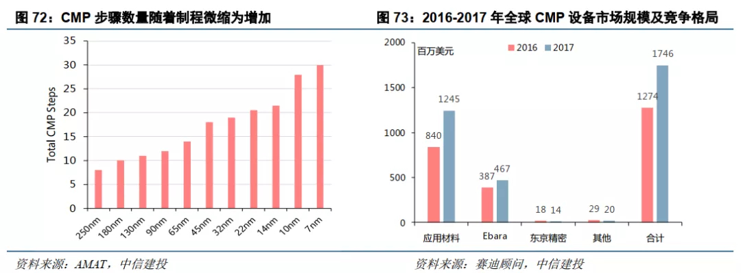 CMP设备市场头部集中趋势明显,国产CMP设备有所突破。随着晶圆制程工艺发展,所需CMP次数增多,CMP设备和CMP材料的需求也大幅提升。在CMP设备市场竞争激烈, CMP设备厂商由1997年的20家逐渐集中在2017年的两家(应用材料和荏原),且CMP设备最大的供应商美国应材的市场份额依然呈现逐年递增的态势。国内目前主要的CMP设备供应商为中电科和华海清科,在长江存储最新的30k产能生产线设备招标中,华海清科在硅、二氧化硅材料CMP设备中标多台,国产化率分别达到33%和33%,而铜和钨CMP设备无国内厂商中标。