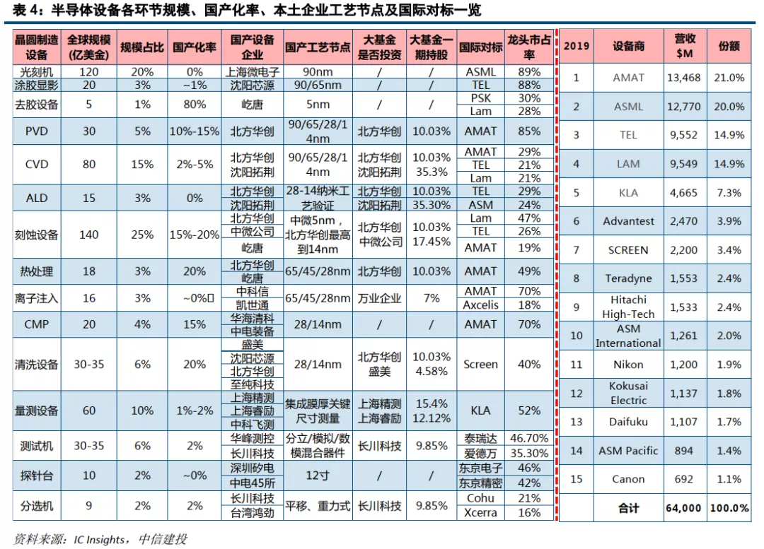 刻蚀/镀膜/清洗设备国产化较好,光刻/离子注入/量测等有差距
