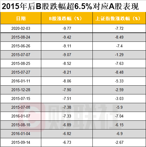 经财联社统计,2015年后B股指数跌幅超6.5%时对应上证指数的表现结果如下:
