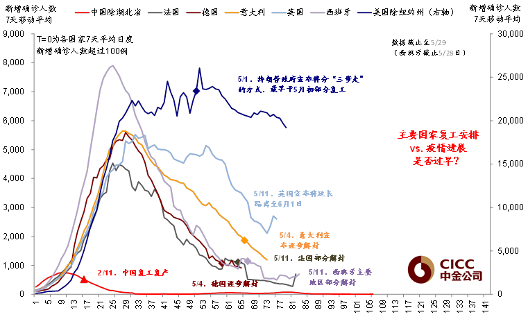 对比不同国家疫情控制与复工安排,欧洲主要国家的情况明显要好于英国和美国,这也就不难解释近期欧洲股市的补涨。美国两害相权取其轻,选择在5月中上旬更早复工起到提振经济和市场的同时,也客观上导致直到现在新增确诊人数仍未有效持续下行的现状。