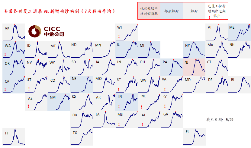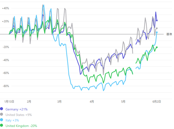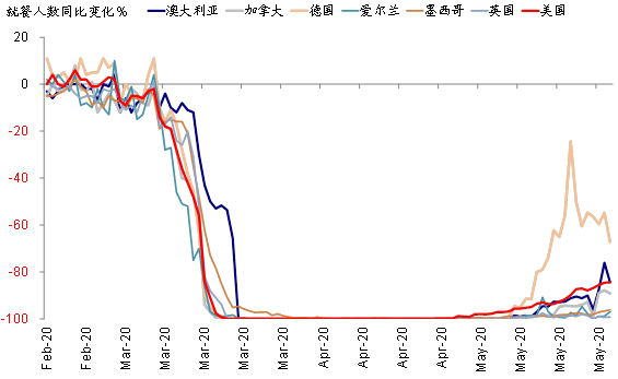 尽管面临诸多不确定性、且包括加州在内的美国部分州的复工后的疫情还在加速上行,但欧美主要国家5月上旬以来的复工复产依然在稳步推进,复工后的积极效果已经体现在一些高频经济指标上,例如OpenTable统计美国就餐人数同比下滑收窄至-85%,汽油终端消费同比下滑收窄至-22%;Apple Mobility美国地图请求情况已经转正为9%,以及主要欧美城市公共交通的逐渐修复等等;甚至昨晚公布的美国5月ADP就业的减少也大幅好于预期。