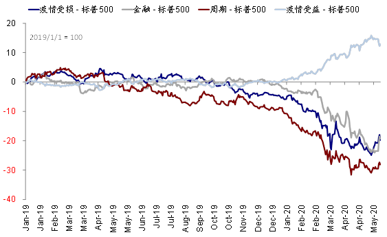 iii. 第三,美股内部近期价值风格的明显领先体现了复工复产后内部风格的轮动。近期美股市场以金融地产等为代表的价值股明显跑赢此前一直领先的成长股,其背景是:一方面,3月底市场反弹以来成长股持续领涨逼近新高,使得与价值股的分化已经逼近历史高位,同时主动型机构在成长股板块的配置比例也升至新高;另一方面,工后一些经济高频指标的改善也有助于市场对于受疫情影响较大的板块以及与经济环境相关度较高的金融周期等板块的预期。
