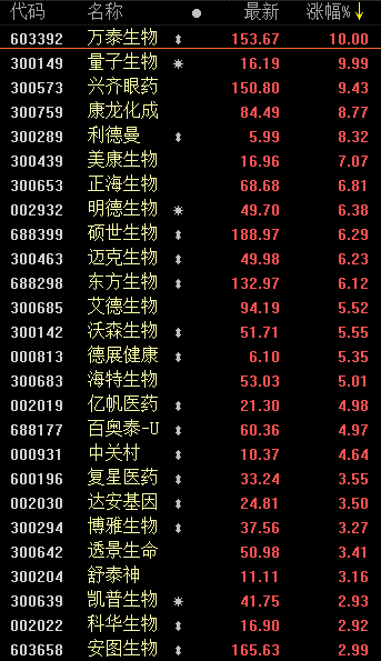 财联社6月12日讯,今天生物医药板块大面积飘红,除了大牛股万泰生物继续涨停外,量子生物也在接近午间收盘时涨停。兴齐眼药、康龙化成、利德曼等涨逾8%;美康生物、迈克生物等大涨7%。