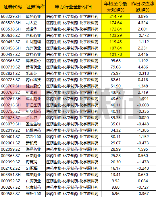 据财联社统计,年初至今,涨幅超过100%的原料药个股多达7只。其中,涨幅最大的是奥翔药业,累计涨幅近215%;司太立、美诺华都累计大涨近175%;同和药业、山河药铺涨逾120%;九洲药业和富祥药业涨逾100%。其余22只原料股年内无一下跌。