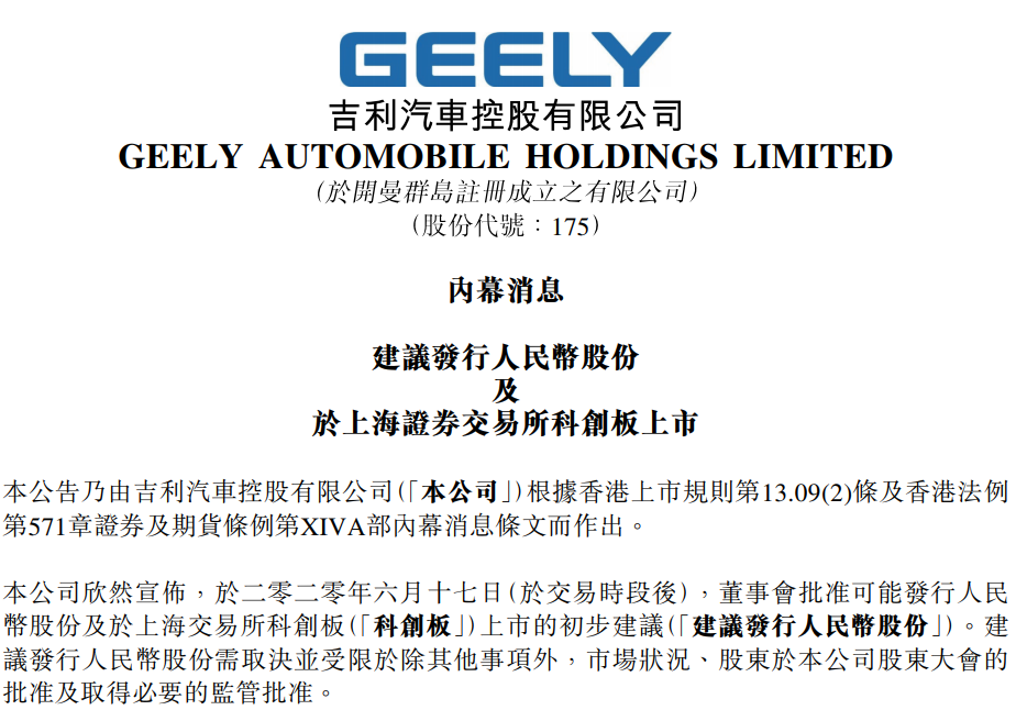 吉利汽车发布公告称,董事会已批准可能发行人民币股份及于上海交易所科创板上市的初步建议。发行的人民币股份规模将不超过拟发行人民币股份数目扩大后公司已发行股本的15%。所得款项目前拟用于业务发展及一般营运资金。