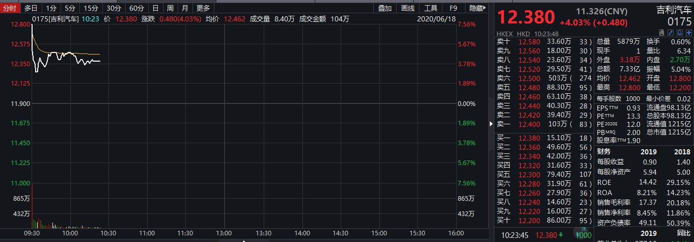 财联社6月18日讯,17日晚间,吉利汽车公告披露,可能发行人民币股份并于上海交易所科创板上市。18日开市,恒生指数低开0.39%报24386点,吉利汽车高开7.56%领涨蓝筹,总市值超1200亿港元。