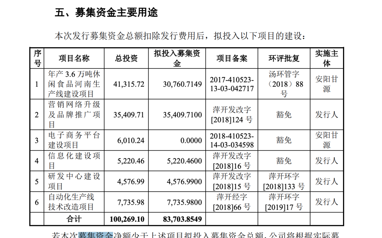 该公司拟投入募集资金8.37亿元用于年产3.6万吨休闲食品的河南生产线建设项目、营销网络升级及品牌推广项目、信息化建设项目、研发中心建设项目,以及自动化生产线技术改造项目。