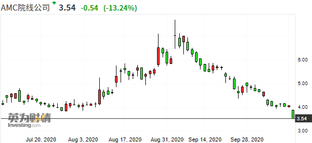 AMC股价周二收盘下跌13%,盘后继续下跌近6%,其他院线股也集体跟跌,Cinemark、Marcus和National CineMedia分别下跌8%、7.2%和9%。