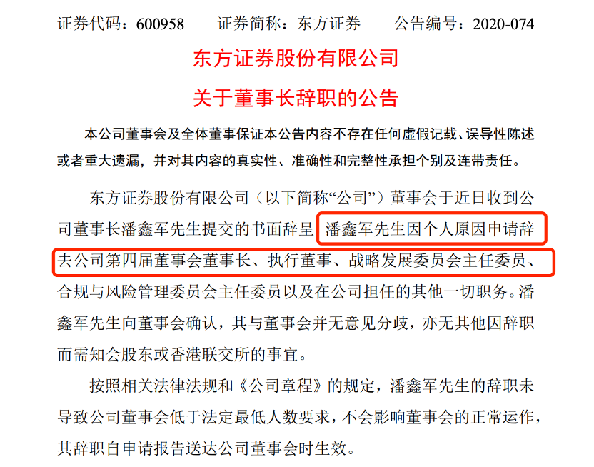 10月16日,东方证券公告称,潘鑫军因个人原因申请辞去公司第四届董事会董事长、执行董事、战略发展委员会主任委员、合规与风险管理委员会主任委员以及在公司担任的其他一切职务。潘鑫军向董事会确认,其与董事会并无意见分歧,亦无其他因辞职而需知会股东或香港联交所的事宜。