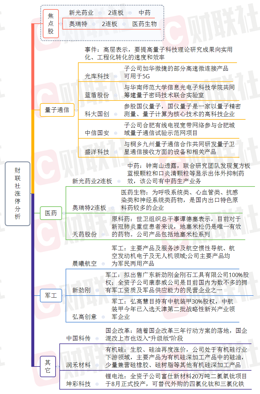 【10月19日午间涨停分析】目前两市共15股涨停(不包括ST及未开板新股),8股封板未遂,封板率65.2%。连板股仅2家,即中药概念的创业板股新光药业、医药概念的次新主板股奥瑞特晋级2连板。板块上,量子科技概念开盘集体大涨,蓝盾股份、科大国创、光库科技、中信国安、盛洋科技涨停,龙头暂时看是蓝盾股份;军工板块逆势走强,晨曦航空、新劲刚、弘高创意涨停。