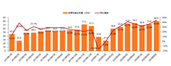 国家邮政局数据显示,2020年9月,全国快递业务量达80.9亿件,同比增速为44.6%。