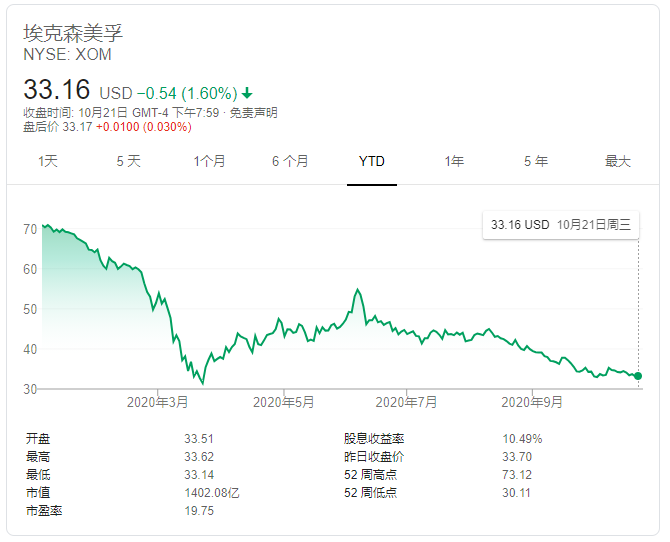 周三,由于市场担忧全球COVID-19感染病例增加将打压油价,埃克森美孚股价下跌1.6%,报33.16美元,目前交易在18年低点附近。今年以来,埃克森美孚股价暴跌52%,一度将其长期把持的美国最大石油和天然气生产商的宝座让位于雪佛龙公司(Chevron Corp.)