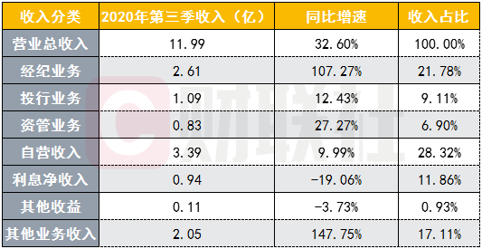 分业务来看,经纪与自营是国海证券第三季业绩双引擎,当季收入分别为2.61亿元、3.39亿元,收入占比分别为21.78%、28.32%,同比增速分别为107.27%、9.99%。投行业务收入1.09亿元,同比增12.43%,收入占比9.11%;资管业务收入0.83亿元,同比增27.27%,收入占比6.90%;其他业务收入2.05亿元,同比增147.75%,收入占比17.11%。