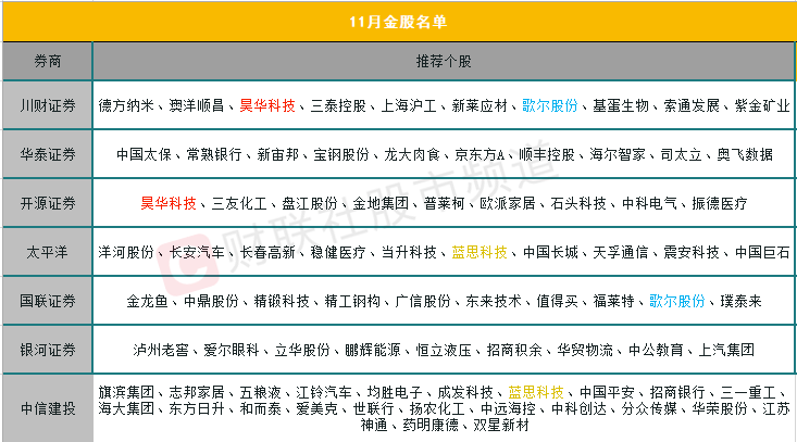 目前已有逾5家券商披露了11月金股组合,推荐行业覆盖新能源产业、消费电子、化工、有色、 白酒、医药医疗、家居等多个行业。