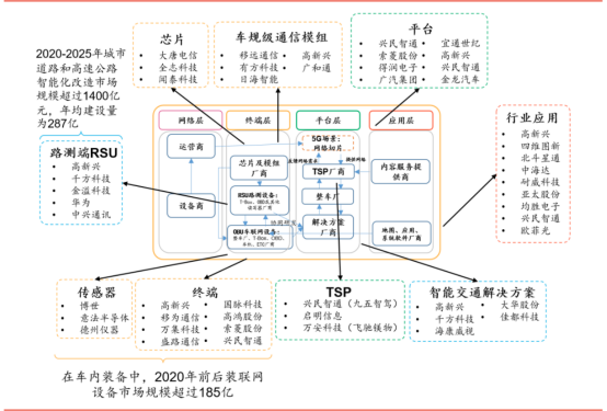 规划提及协调推动智能路网设施建设。华泰证券研报此前梳理车联网产业链投资图谱,具体如下: