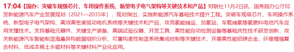 值得注意的是,通知指出,实施新能源汽车基础技术提升工程。突破车规级芯片、车用操作系统、新型电子电气架构、高效高密度驱动电机系统等关键技术和产品。