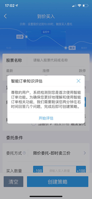 该功能针对股票、理财等交易场景为客户提供交易策略、行情监控、自动化委托等一系列智能交易服务,支持到价买入、到价卖出、止盈止损、反弹买入、回落卖出五大常用策略,订单有效期较普通委托延长,以提高交易执行效率、节约时间成本,降低人性干扰。
