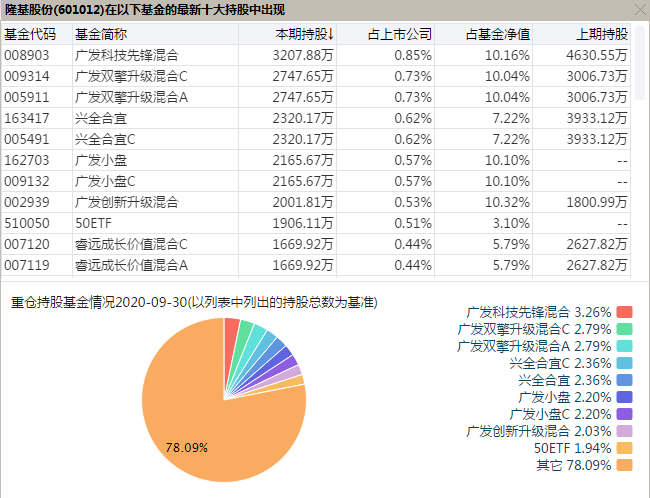 梳理重仓持股隆基股份的基金,财联社记者发现,持仓占比超10%的共7只基金,均为广发基金旗下的基金产品,包括广发创新升级混合(10.32%)、广发科技先锋混合(10.16%)、广发小盘成长混合(10.10%)等,基金经理均由刘格菘或与同事一起担任。
