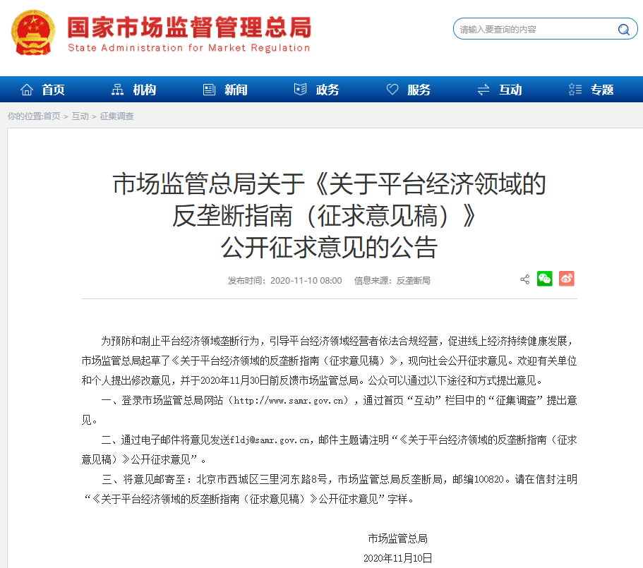 消息面上,市场监管总局11月10日就《关于平台经济领域的反垄断指南(征求意见稿)》公开征求意见。这标志着继汽车业、原料药领域,又一重点领域将有专门的反垄断指南即将出台。