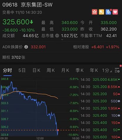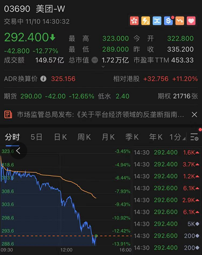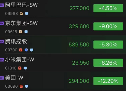 截至发稿,美团跌超12%,股价跌破300港元关口。京东集团一度跌超10%,创有记录以来盘中最大跌幅。此外,阿里巴巴跌逾4%,腾讯控股跌超5%。