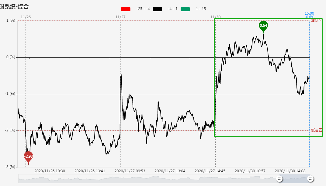 短线市场情绪,开盘快速走强,从周五的低迷区回升至0轴附近。早盘整体处于震荡向上状态,一度逼近活跃区,午后与指数同步回落,尾盘小幅修复。