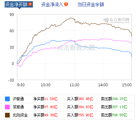北向资金,沪股通净买入11.59亿,深股通净买入37.80亿。从今日资金流入曲线来看,基本与沪指及创业板指的走势吻合。