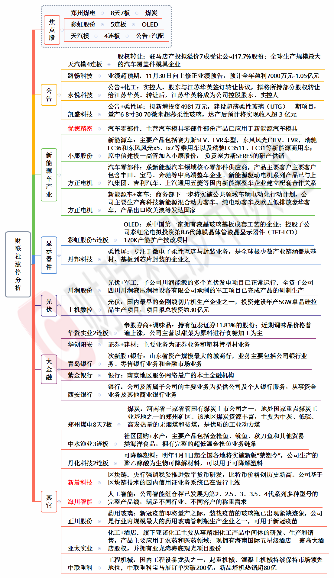 【12月1日午间涨停分析】两市共25股涨停(不包括ST及未开板新股),8股封板未遂,封板率76%,两市共5家连板股,其中OLED的彩虹股份5连板,股权转让的天汽模4连板,煤炭的郑州煤电3连板,可降解概念的丹化科技2连板。参股券商的华资实业2连板。板块上,银行、券商等大金融板块再度爆发,青岛银行、紫金银行等多股反包涨停,新能源汽车仍是市场主线,游戏、数字货币、医药疫苗等超跌板块轮动反弹,可降解塑料、光伏、机场航运等板块盘中拉升。